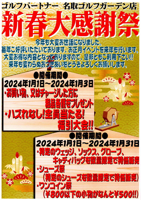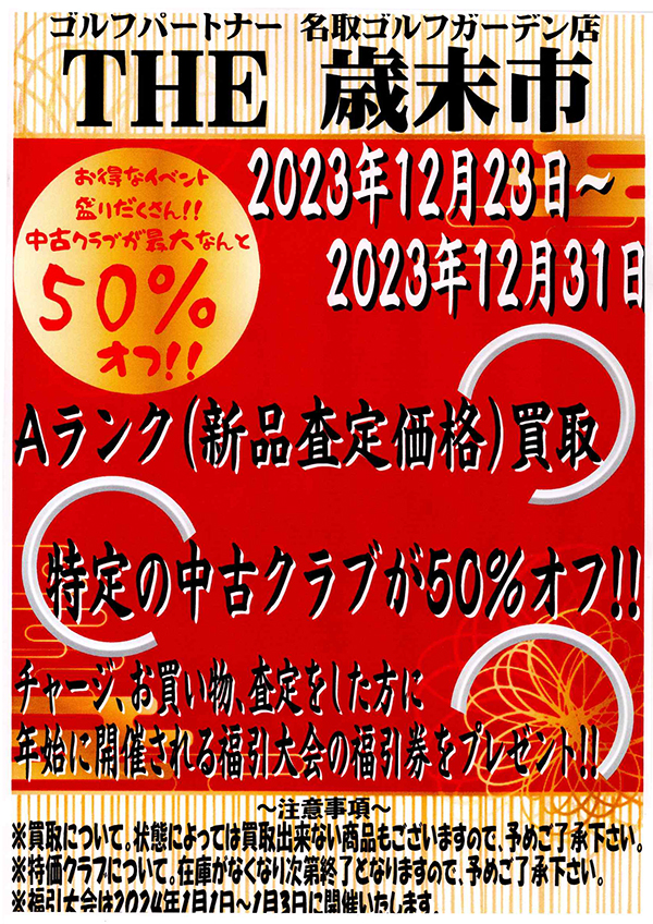 | イベント内容 | ◎特定の中古クラブが50%オフ!! ◎Aランク(新品査定価格)買取 ◎福引券プレゼント! (チャージ・お買い物・査定した方/年始に開催) |