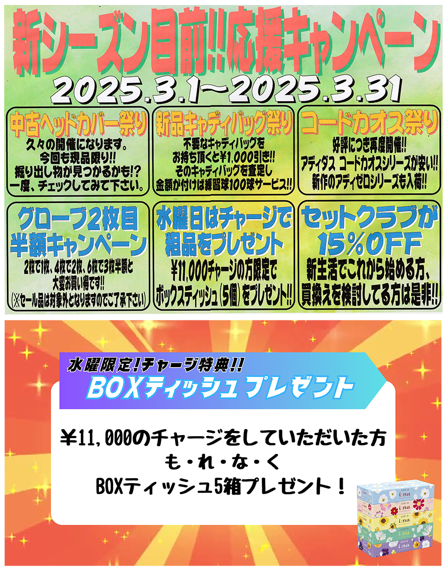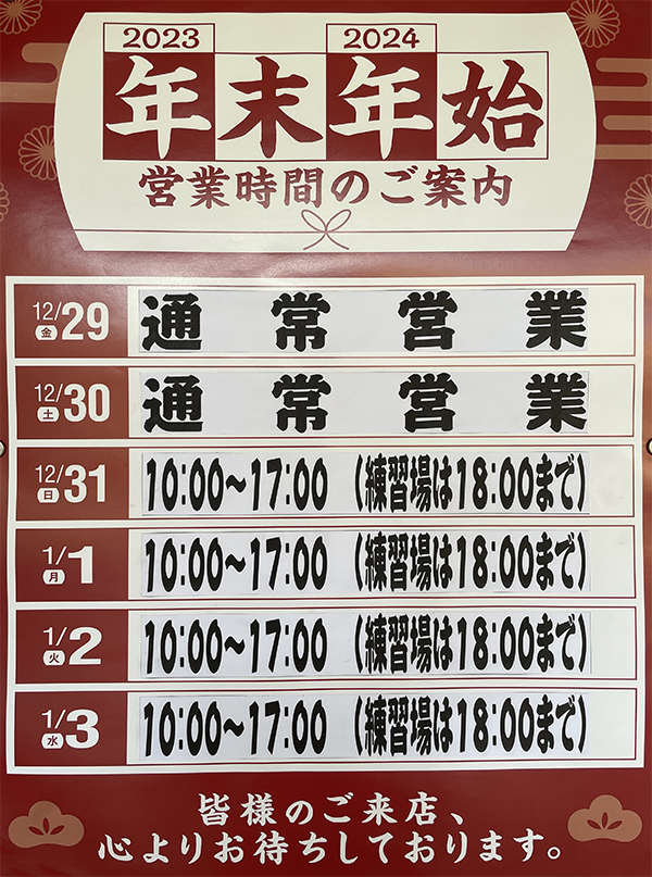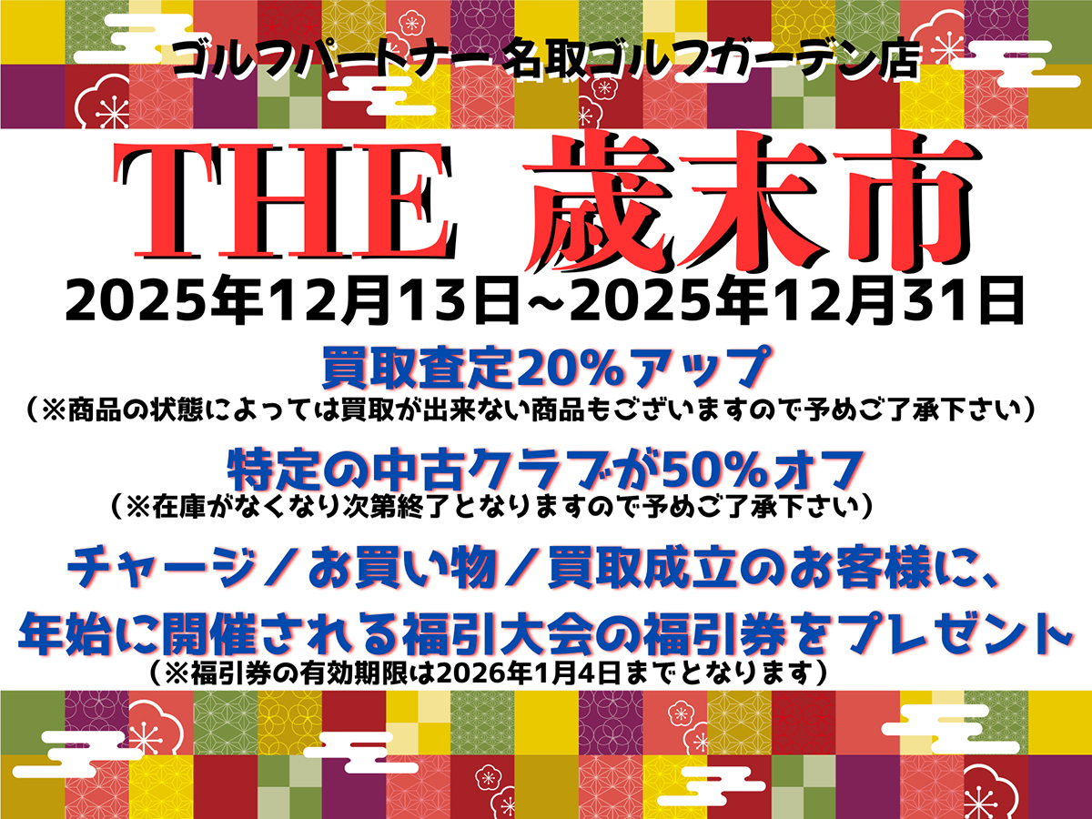 ◎特定の中古クラブが 50%OFF!! ※在庫が無くなり次第終了となりますので予めご了承ください ◎福引大会の福引券プレゼント! (チャージ・お買い物・査定した方/年始に開催) 有効期限は2026年1月4日(日)までとなります。 |