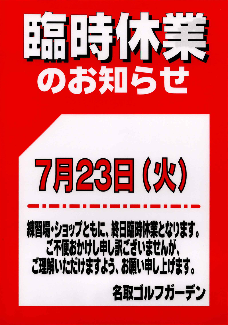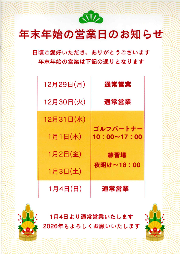 | 備 考 | 工事期間は原則クローズ。進捗状況よっては近距離のみ使用クラブの制限での営業も考慮 ゴルフパートナーは10:00より17:30迄営業いたします |