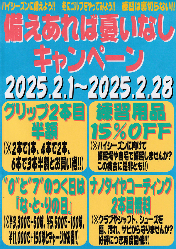 ◎"0"と"7"がつく日は 『なとりの日』 (¥3,300で+50球, ¥5,500で+100球, ¥11,000で+150球とチャージがお得!!) 対象日:2/7・2/10・ 2/17・2/20・2/27 ◎ナノダイヤコーティング 2本目無料!! (クラブやシャフト、シューズを傷、汚れ、サビから守りませんか?好評につき再度開催!!) |