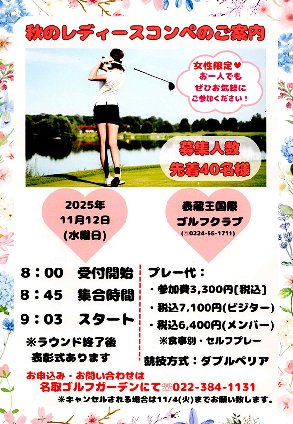 2025年11月12日(水)、宮城県の名門・表蔵王国際ゴルフクラブにて「第3回 名取ゴルフガーデン レディースゴルフコンペ」が華やかに開催されました。